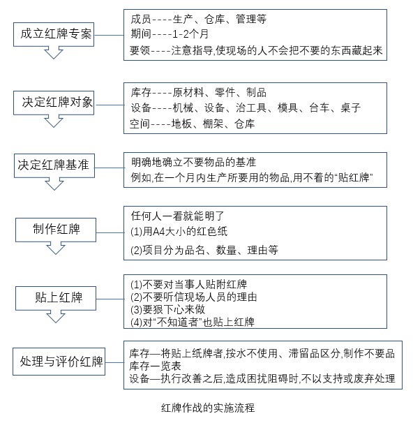 貼附的紅牌移往紅牌集中處后,應(yīng)予以記錄。將貼上紙牌者,按永不使用、滯留品區(qū)分,制作不要品庫存一覽表,對于設(shè)備-執(zhí)行改善之后,造成困擾阻礙時,不以支持或廢棄處理。紅牌作戰(zhàn)看板流程具體細節(jié)內(nèi)容如上圖所示。